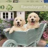 De Ravensburger puzzel toont twee schattige golden retriever-puppy’s die in een lichte houten ton zitten. Deze puzzel is een geweldige aanvulling op elke thuiscollectie en dient na het leggen als een prachtig decoratief element.