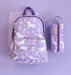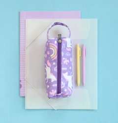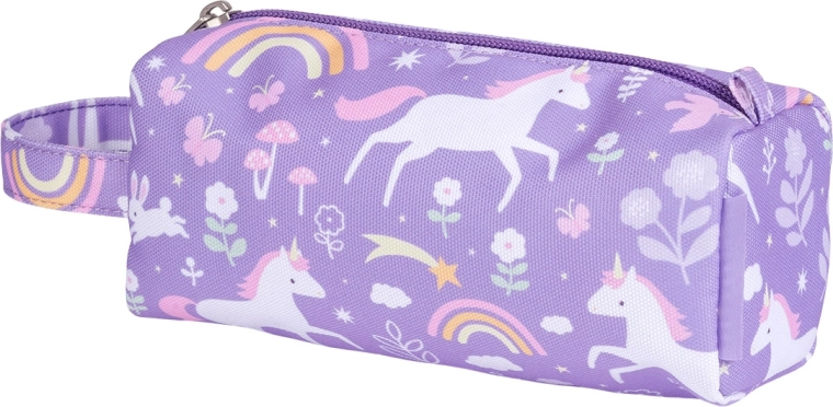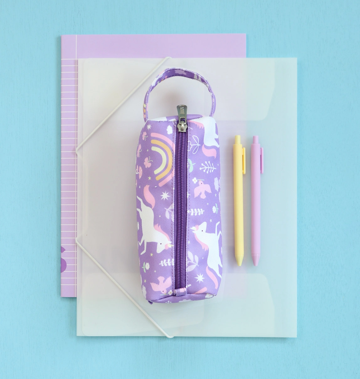 Paarse etui voor kleurpotloden, stiften of schrijfgerei met eenhoorn, bloemen en regenboog motieven is gemaakt van duurzaam polyester. Ideaal voor school, reizen of clubs, sluit met een rits en heeft een handige handgreep voor gemakkelijk dragen. Zorgt voor veilige opslag van uw schrijfgerei.