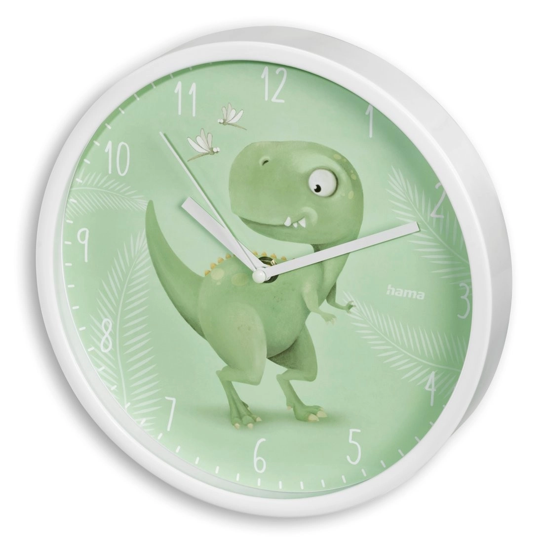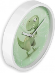 Deze kinderwandklok brengt vrolijkheid en kleur in elke kamer. Dankzij de groene wijzerplaat met dinosaurusmotief trekt hij de aandacht van kinderen en stimuleert hij hun interesse om de klok te leren lezen.