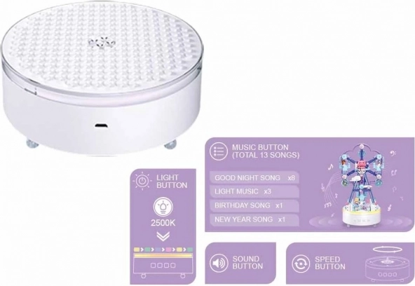 Geniet van zowel het bouwen als het eindresultaat: de SLUBAN muzikale carrousel combineert een doordacht tandwielmechanisme met indrukwekkende licht- en geluidseffecten. De basis draait op het ritme van bekende melodieën – van rustgevende wiegeliedjes tot verjaardags- en nieuwjaarslied – en bezorgt plezier aan kleine én grote bouwers.