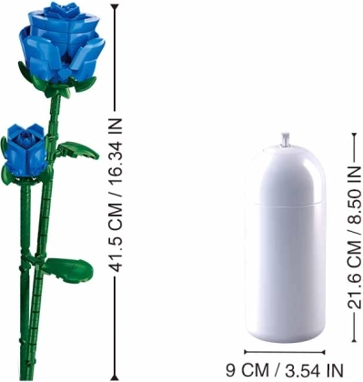 Deze design-bouwset verandert je plank of tafel in een bloeiende tuin. De blauwe rozen in de vaas onderscheiden zich door realistische vormen, een stevige constructie en een aangename hoogte van 41,5 cm, waardoor ze zowel op zichzelf als in combinatie met andere bloemen uit de serie prachtig uitkomen.
