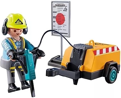 Wat een lawaai! Op de bouwplaats wordt hard gewerkt. De bouwvakker van PLAYMOBIL ACTION HEROES is klaar voor veeleisend wegenwerk. Dankzij de afneembare helm en handschoenen is hij op elke uitdaging voorbereid, terwijl de krachtige pneumatische hamer, aangesloten op de compressor, zelfs met harde ondergronden raad weet.