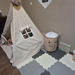 Breng stijlvol orde in huis. De grote KRUZZEL-mand met afsluitbaar trekkoorddeksel beschermt de inhoud tegen stof en nieuwsgierige blikken, terwijl de stevige stoffen met waterafstotende binnenlaag dagelijks gebruik moeiteloos weerstaan. Dankzij de neutrale kleuren en de leuke print past hij in de kinderkamer, badkamer en slaapkamer.