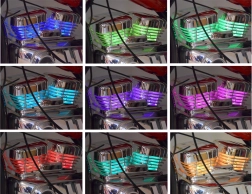 - Lichteffecten: cilinders knipperen op het ritme van de muziek, aparte knop voor de koplamp, schakelaar voor langzaam/snel rijden.