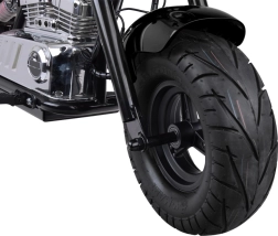Het robuuste stalen frame, opblaasbare banden en achtervering dempen oneffenheden op asfalt en klinkers. Voor de eerste ritten zijn er zijwieltjes die later verwijderd kunnen worden; tijdens het stilstaan is er een praktische standaard. Dankzij een draagvermogen tot 80 kg is de chopper ook geschikt voor oudere kinderen.