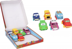 Licht autootje van zacht plastic met een lengte van 9 cm en vrijlopende wielen. Keuze uit 6 varianten: Kever, Trabant, sportwagen, Mini, bus, bestelwagen.