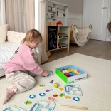 De kleurrijke dobbelsteen en kaarten voegen regels toe: kinderen vissen op kleuren, leggen puzzelonderdelen op hun bordjes en leren beurten afwisselen en kleuren herkennen.