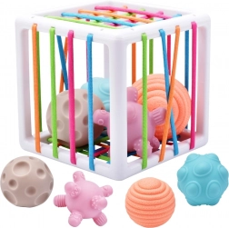 Deze sensorische kubus met elastische bandjes is een ideale set voor kinderen die de wereld graag via aanraking ontdekken. Zachte vormen met verschillende oppervlakken kunnen gemakkelijk worden vastgepakt, geknepen en door de elastische banden worden gedrukt. Het spel stimuleert op een natuurlijke manier de fijne motoriek, de tastzin en de coördinatie, en versterkt tegelijk geduld en logisch denken.