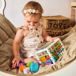 Elk onderdeel verschilt in textuur, kleur en vorm, waardoor elk spel anders en motiverend is. Wanneer het kind ouder wordt, is de kubus ook geschikt om kleuren, vormen en eerste letters te leren – ideaal voor een vroege peuter-/kleutervoorbereiding.