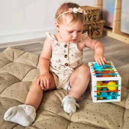 De sensorische kubus van WOOPIE combineert slim spel met leren. Dankzij de elastische bandjes oefenen kinderen veilig grijpen en oog-handcoördinatie en trainen ze de tastzin. Eén zijde fungeert als klassieke insteek-sorter: het kind zoekt de juiste vorm of letter en plaatst deze in de kubus.