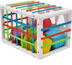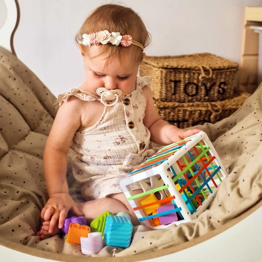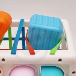 De flexibele elastische bandjes aan de zijkanten van de kubus maken het voor kinderen eenvoudig om onderdelen erin te schuiven en eruit te trekken. Dit traint de fijne motoriek en maakt het spel vloeiend en motiverend.