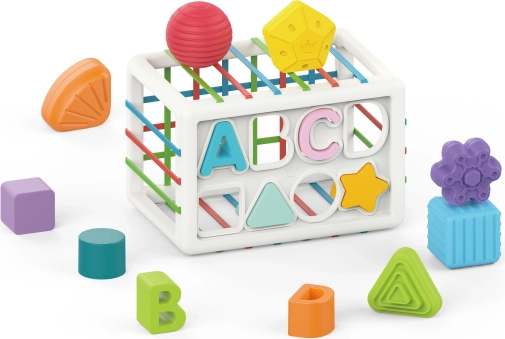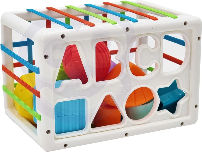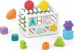 Eén zijde van de kubus is een klassieke sorter met uitsparingen voor vormen en letters. Kinderen leren op een speelse manier vormen en kleuren herkennen en maken kennis met de eerste letters.