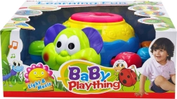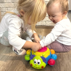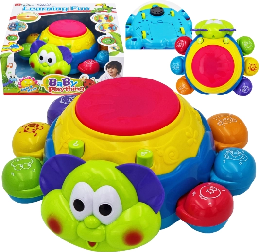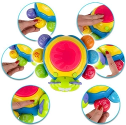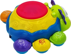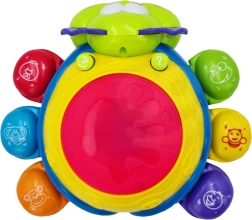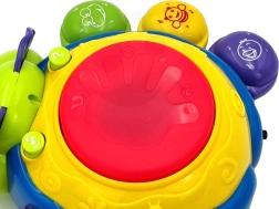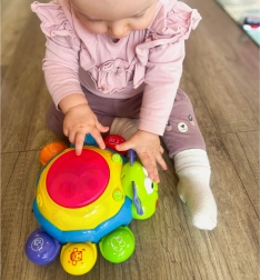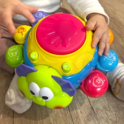 Licht- en geluidseffecten worden geactiveerd door op de drum bovenop het speelgoed te drukken, wat de oog-handcoördinatie en cognitieve vaardigheden vanaf jonge leeftijd ondersteunt.
