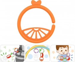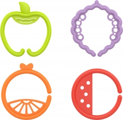 De set van 4 kleurrijke fruitringen biedt vanaf de geboorte veilig kauwen, leuk koppelen en praktisch ophangen van favoriete speeltjes. Dankzij het eenvoudige vastklikken maak je een ketting van elke gewenste lengte, die je gemakkelijk aan de kinderwagen of autostoel bevestigt. Diverse kleuren, texturen en vormen prikkelen de zintuigen en ondersteunen de hand-oogcoördinatie.