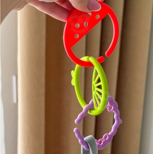 Je klikt de ringen moeiteloos aan elkaar tot een ketting en bevestigt ze snel aan de kinderwagen, autostoel of babygym – praktisch voor onderweg en thuis.