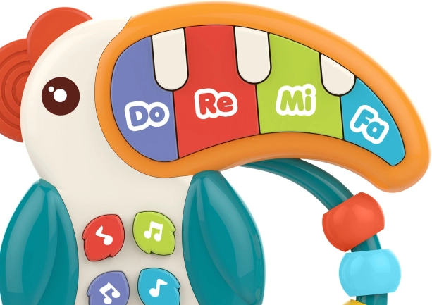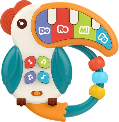 Het leuke pelikaan-pianootje van Woopie combineert een muzikaal speelgoed, sensorische elementen en een bijtspeeltje 3-in-1. Vier kleurrijke toetsen spelen melodieën en tonen af, de schuivende kral... Meer tonen