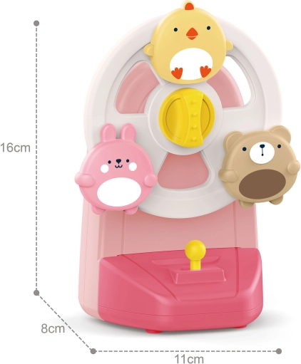 Breng een vrolijke wereld van kleuren en melodieën tot leven! Deze compacte mobiel/roulette met schattige diertjes begint te draaien zodra je de hendel indrukt en begeleidt kinderen met de aangename tonen van de speeldoos. Dankzij de stabiele zuignap bevestig je hem eenvoudig op een vlak oppervlak – bijvoorbeeld op een tafel of het blad van een kinderstoel – zodat het kind veilig kan spelen. De achterkant met een wijzerplaat doet speels denken aan een oude telefoon en prikkelt de fantasie.