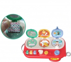 Deze slimme educatieve toy heeft drie raampjes, die elk op een andere manier opengaan – met een combinatie van symbolen, een sleutel of een knop en draairegelaar. Binnenin vinden kinderen verschillende verrassingen: uittrekbare “sjaaltjes”, een tandafbeelding met een bewegend borsteltje en een figuurtje met een draaibare kledingkeuze. Elke handeling heeft een duidelijk resultaat, wat het begrip van oorzaak en gevolg versterkt.