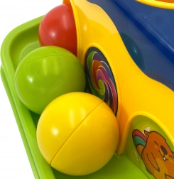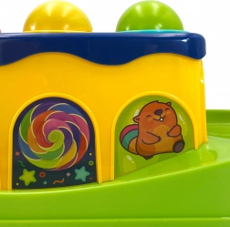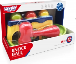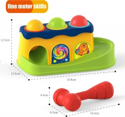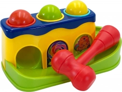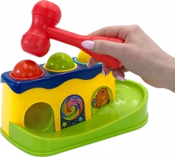 Met behulp van het hamertje slaat het kind op de balletjes, die vervolgens over de baan naar beneden rollen. Het kind kan volgen hoe ze rollen, wat veel plezier geeft.