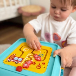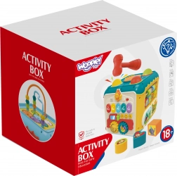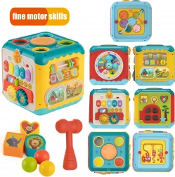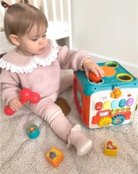 Op een van de zijden vind je een pianootje waarmee het kind toetsen kan bespelen die prettige geluiden maken. Een andere attractie is het hamerbankje, waarbij kinderen met een hamer gekleurde balletjes in de kubus slaan.