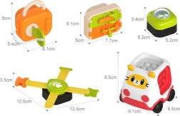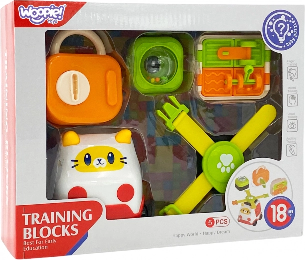 Het schattige poezenautootje van Woopie met 4 aanklikbare manipulatieve blokken is een interactieve speelgoedset voor peuters vanaf 18 maanden. Het ondersteunt de fijne motoriek, zintuiglijke waarneming en creativiteit dankzij elementen zoals een slot met sleutel, raampjes met grendel, een draaielement met kraaltjes en bandjes met gespen. Eenvoudig vast- en losklikken van onderdelen, veilige en duurzame materialen.
