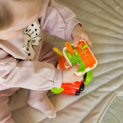 Het roterende onderdeel met gekleurde kraaltjes bevordert visuele tracking, terwijl de bandjes met gespen het vastmaken trainen en de vingerbehendigheid vergroten.