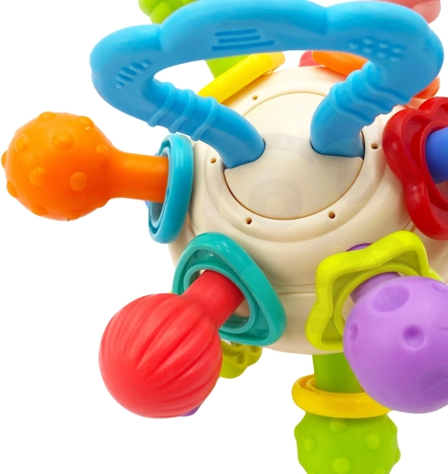Combineert de eigenschappen van een bijtring en een rammelaar, en biedt kinderen verschillende manieren om te spelen.