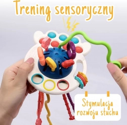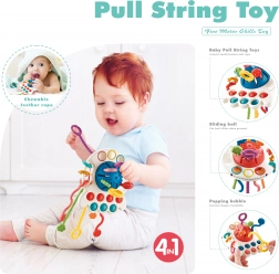 Ontdek het multifunctionele, door de Montessori-methode geïnspireerde sensorische speeltje en bijtring, dat de ontwikkeling van de zintuigen en de fijne motoriek stimuleert en verlichting bij doorkomende tandjes biedt. Gekleurde trekkoordjes met verschillende texturen, draaielementen en popp-bubbels nodigen uit om te grijpen, te trekken en te ontdekken, terwijl de veilige materialen en het eenvoudige onderhoud ouders geruststellen.