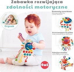Dit WOOPIE BABY sensorische speelgoed is ontworpen om baby’s op een natuurlijke manier aan te moedigen zelfstandig te ontdekken. Dankzij de combinatie van verschillende texturen, vormen en functies (trekken, knijpen, draaien) trainen kinderen hun grijpreflex, oog-handcoördinatie en concentratie. Zachte bijtonderdelen masseren het tandvlees voorzichtig en bieden verlichting bij doorkomende tandjes.