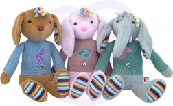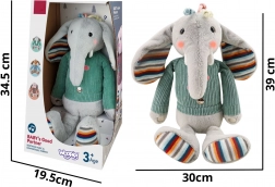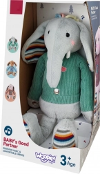 De interactieve pluchen olifant van Woopie is uitgerust met drie sensorzones op de voeten en de buik die bij aanraking muziek afspelen. De roze wangetjes lichten op, wat een magische sfeer rond het speeltje creëert. De knuffel draagt een trui, waaronder ruimte is voor 3 batterijen. Deze zachte aanraak-olifant wordt een vriend voor je kind voor vele jaren.