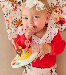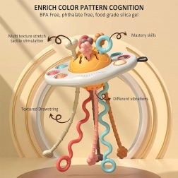 Dit Montessori-speelgoed voor baby’s van WOOPIE BABY in UFO-vorm biedt rijke sensorische prikkels dankzij zes koorden met verschillende texturen en kleuren, drie zachte knoppen en één stevige schuifknop. Trekken aan de koorden zorgt voor diverse geluiden en zachte trillingen, wat nieuwsgierigheid en concentratie bevordert. Zachte randen en gestructureerde oppervlakken bieden verlichting voor gevoelig tandvlees tijdens het tanden.