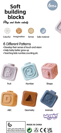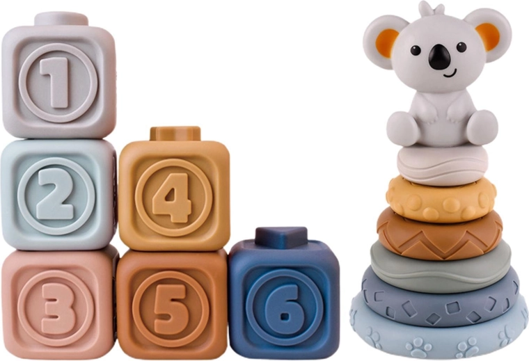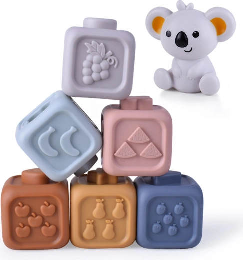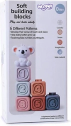 Zachte sensorische siliconen blokken van WOOPIE in zachte pasteltinten ondersteunen de vroege ontwikkeling van je kind vanaf de geboorte. Zes blokken met verhoogde cijfers stimuleren tast, zicht en logisch denken; het veilige materiaal dient ook als bijtring tijdens het doorkomen van tandjes. De blokken kun je stapelen, indrukken (ze piepen), aan elkaar koppelen dankzij de reliëfs en er ook van genieten tijdens waterspelletjes. De schattige koala geeft de set een speelse charme.
