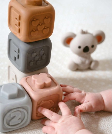 Ontdek een veelzijdige set die leren en plezier combineert. Zachte en veilige siliconen blokken met cijfers motiveren kinderen om te beginnen met tellen en vormen en kleuren te herkennen. Dankzij de aangename textuur stimuleren ze de zintuigen en ondersteunen ze de fijne motoriek, de greep en de oog-handcoördinatie.