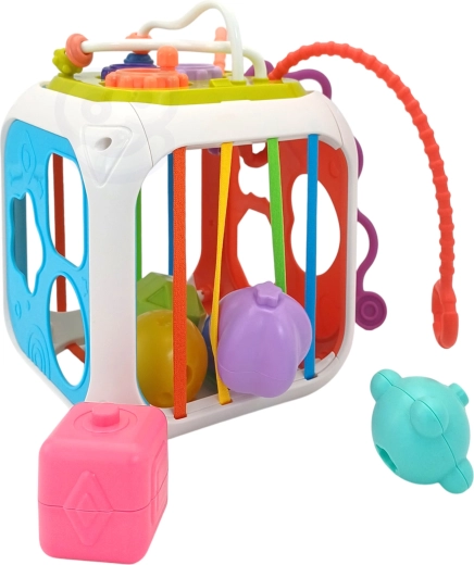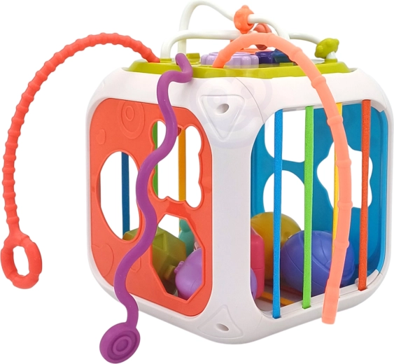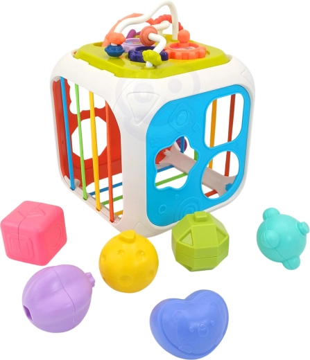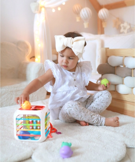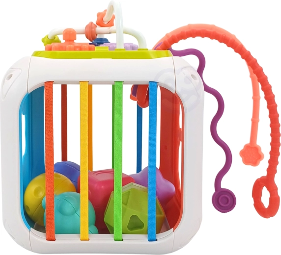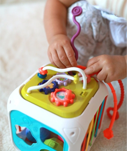 De kubus is gemaakt van hoogwaardige ABS-kunststof en siliconen en is duurzaam en veilig voor kinderhandjes. Er zijn ook sorteerblokjes met verborgen belletjes inbegrepen, die aanzetten tot experimenteren met geluid, vormen en kleuren. Het afneembare bovendeel vergroot de speelmogelijkheden – het kind kan het afzonderlijk gebruiken op een speelmat of in de kinderwagen.