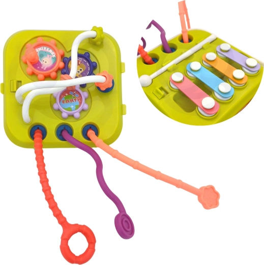 Het afneembare paneel met mini-xylofoon wekt liefde voor muziek en ondersteunt ritme en auditieve waarneming. Het kind traint precisie van de greep en coördinatie bij het slaan op de toetsen.