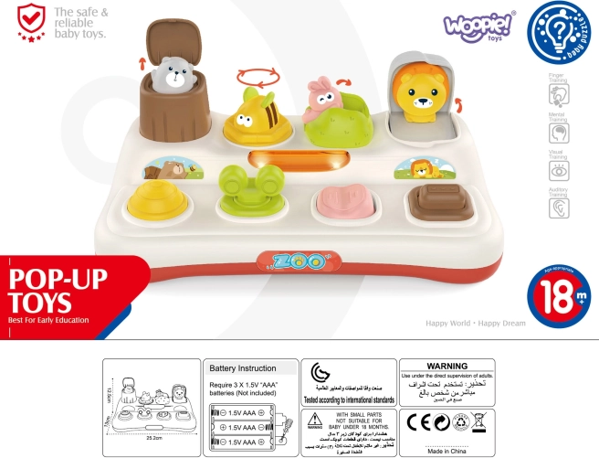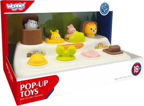 Het interactieve pop-up speelgoed van WOOPIE biedt kinderen vanaf 18 maanden een speelse vorm van leren. De verschillende bedieningselementen – schakelaar, draaiknop en knoppen – activeren het mechanisme waardoor de diertjes tevoorschijn springen. Zo trainen kinderen de oog-handcoördinatie, ontwikkelen ze hun zintuiglijke waarneming en leren ze hoe hun actie een reactie veroorzaakt.
