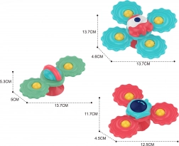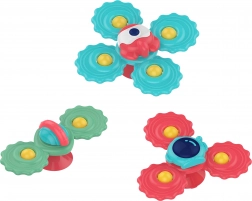 Interactieve set van 3 kleurrijke spinners van WOOPIE die kinderen zowel plezier als zintuiglijke ontwikkeling biedt. Elke spinner heeft 2, 3 of 4 armen, hecht eenvoudig op gladde oppervlakken dankzij de zuignap en is gemaakt van veilige materialen die ook als bijtring kunnen dienen. Perfect voor de stimulatie van de fijne motoriek, het zicht en de concentratie.