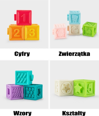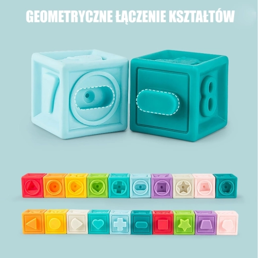 De set bevat 20 blokken in zacht op elkaar afgestemde kleuren, die eenvoudig gestapeld en onderling verbonden kunnen worden. Ze stimuleren visueel-auditieve coördinatie, motorische ontwikkeling, visuele waarneming en logisch denken. Cijfers en wiskundige symbolen nodigen bovendien op een natuurlijke manier uit tot leren tellen en eenvoudige opdrachtjes.