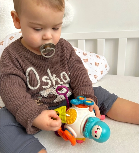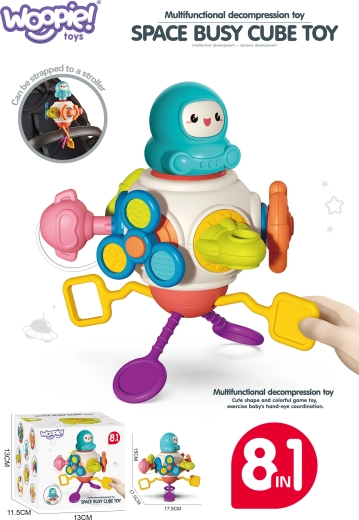 - 8-in-1 (ronddraaiende astronaut, oprolmechanisme/“bijtring”, spinner, terugtrekfunctie, stuur met geluiden, sleutel in het slot, schuivende boot, knop met geluid)