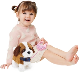 Schattige pluchen hond van 22 cm die, na aansluiting van de kabel met afstandsbediening, kan lopen, blaffen, met de staart kwispelen en met het hoofd bewegen. De bediening is eenvoudig: door het riempje in te drukken start de wandeling, door het hoofd aan te raken activeer je de effecten en na een applaus begint het hondje weer te lopen. Een geweldige interactieve speelgoedset voor kinderen die zowel vermaakt als de zintuigen ontwikkelt.
