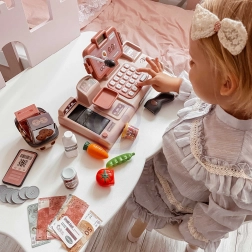 Deze stijlvolle WOOPIE kinder kassa brengt authentiek winkelspeelplezier: kinderen wegen fruit en groenten, scannen producten en rekenen de aankoop af via het overzichtelijke toetsenbord. Dankzij de betaalterminal proberen ze betalen met kaart en contactloos, de geldlade opent met de knop OPEN en de microfoon werkt echt.