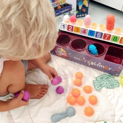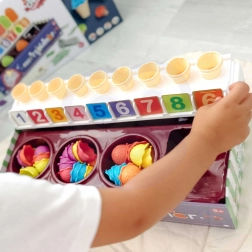 Het speelgoed maakt het mogelijk om cijfers en kleuren te leren via stapel- en sorteeroefeningen.