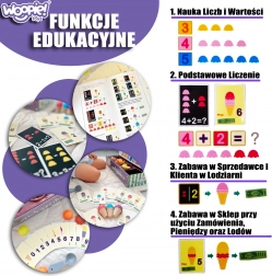 De ijssalon-speelset van het merk Woopie biedt niet alleen speelplezier als kleine ijsverkoper, maar ook het leren van cijfers, kleuren en basisoptellen. Bevat 87 onderdelen, waaronder ijsbolletjes, hoorntjes, bestelkaarten, geld, fiches met cijfers en een ijslepel.