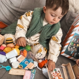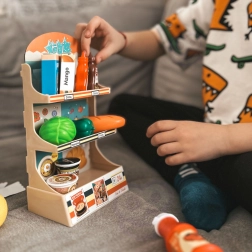 Winkeltje spelen stimuleert zelfstandig denken, communicatie en creatief spel. Dankzij 42 onderdelen – van fruit en groenten tot drankjes en conserven – kunnen kinderen eigen scènes creëren en alledaagse situaties oefenen.