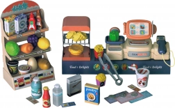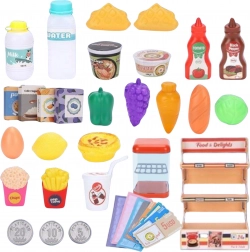 De set bevat fruit, groenten, drankjes, conserven, bankbiljetten en munten – alles voor vele uren creatief winkeltje spelen.