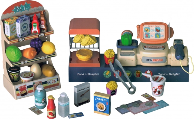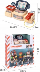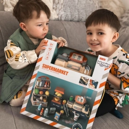 Met deze realistische supermarktset proberen kinderen de rol van verkoper én klant. De kassa met scanner, een werkende kassalade en papieren bankbiljetten en munten leert de basis van financiële geletterdheid en sociale interactie. Er is ook een weegschaal en een ruime keuze aan etenswaren.