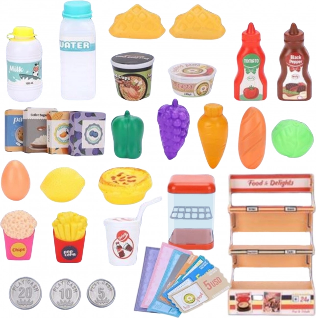 - Rijke uitrusting (42 delen): papieren geld, munten, fruit, groenten, drankjes en meer.