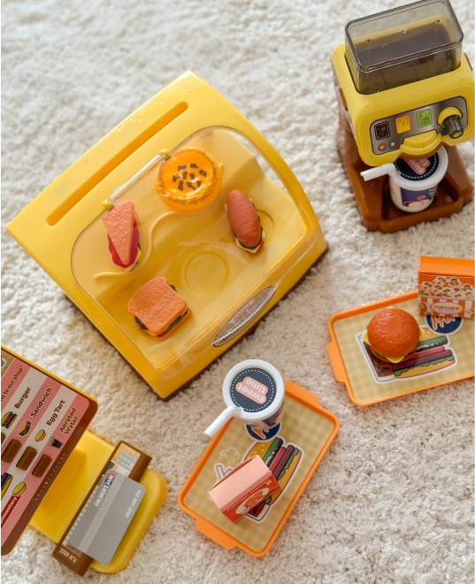 De set bevat 25 onderdelen, waaronder hamburgers, frietjes, sandwiches, bekers met rietjes, dienbladen, een menuscherm en een drankdispenser waarin je water kunt gieten om echt in de bekers te “schenken”. Gekleurde kunststof accessoires zijn licht en ideaal voor rollenspellen – bediening, kok en kassamedewerker.