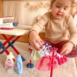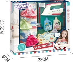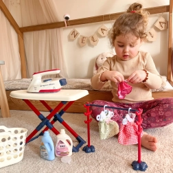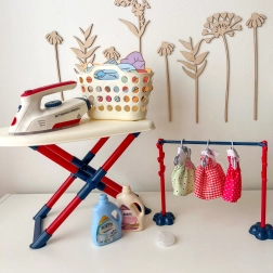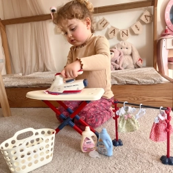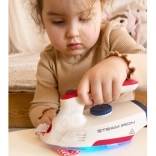 Het strijkijzer is een veilige speeltje voor kinderen omdat het niet opwarmt, maar het is uitgerust met veel functies die het spel tot leven wekken: een knop voor het nabootsen van echte strijkgeluiden, LED-licht en geluidseffecten in de vorm van liedjes. Deze set is ideaal voor kinderen die graag hun ouders nadoen bij dagelijkse activiteiten.