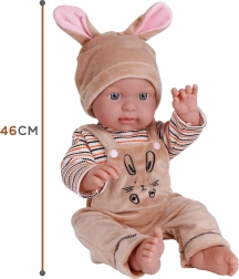 Deze realistische babypop in een konijnenpak is gemaakt voor liefdevol spelen. Het pak met capuchon en oortjes, het rompertje met schattig motief en de zachte schoentjes creëren een teder uiterlijk waar kinderen van houden. Dankzij de beweegbare ledematen kun je de pop gemakkelijk laten zitten of staan, wat de speelmogelijkheden vergroot.